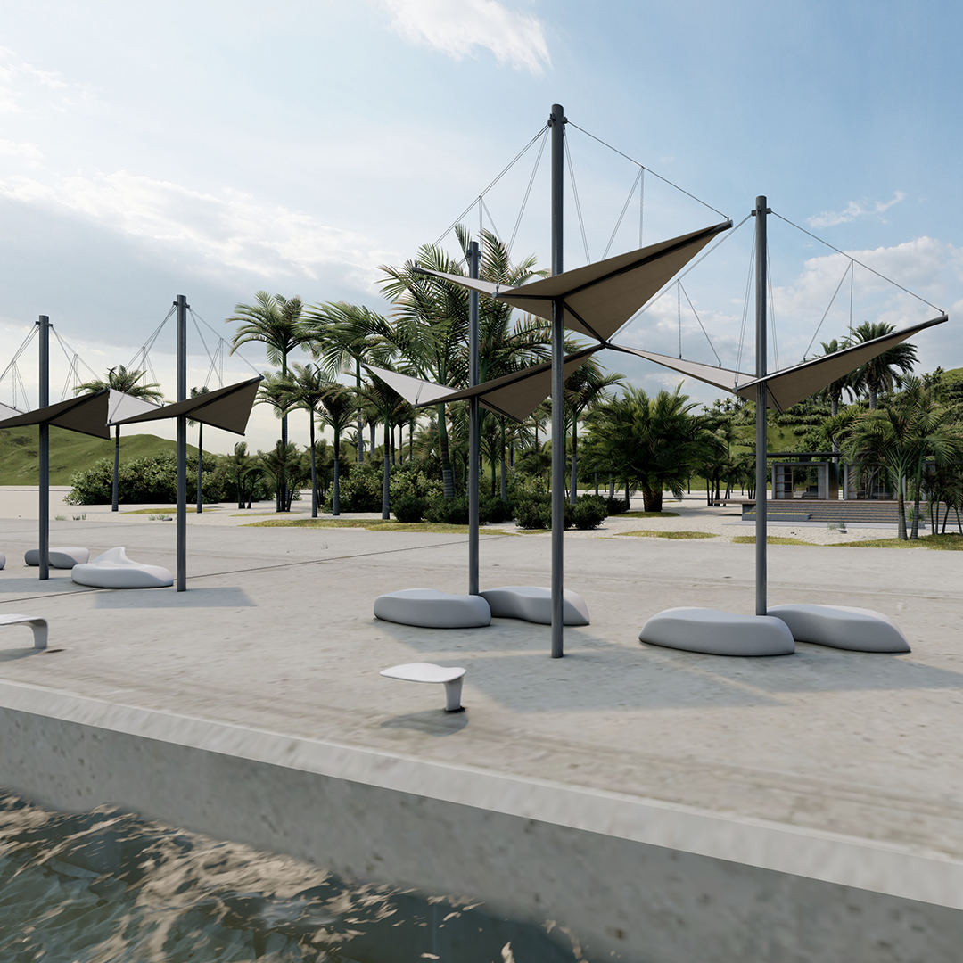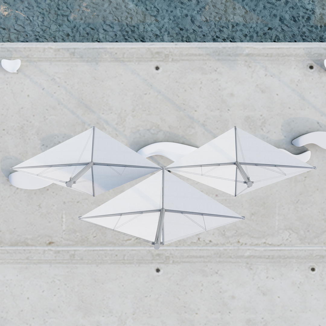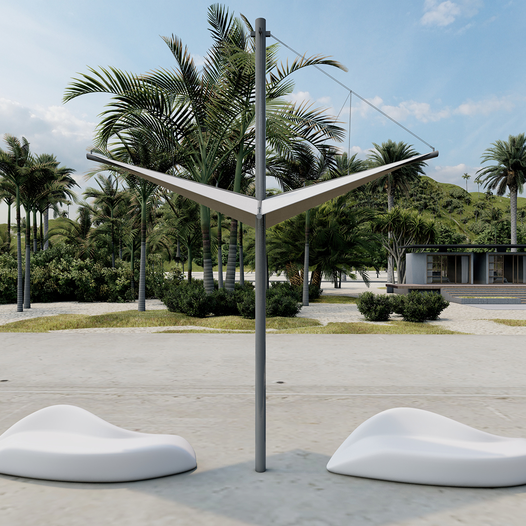 Pieza de mobiliario urbano inspirada en la vida marina, capaz de despertar emociones tanto en paseos marítimos como en puertos… Un conjunto formado por estructuras tensostáticas, que no sólo cumple la función de dar sombra, sino que también ennoblece con su calidad el espacio urbano donde se ubica.